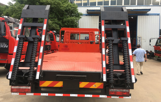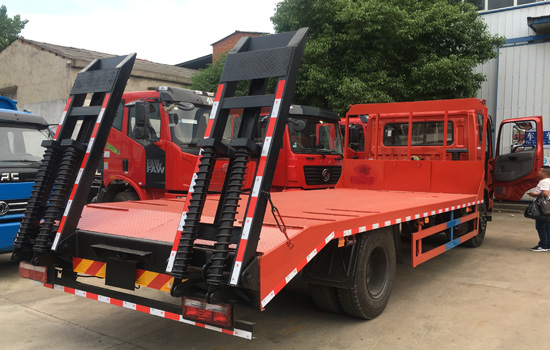 上裝配置:平板底板橫梁采用100*100*5mm方管,底板采用5mm或8mm花紋板,帶加密斜支撐,爬梯采用雙彈簧加強型設計,采用三道筋+雙彈簧加固焊接,可選裝液壓爬梯或折疊加長型液壓爬梯,斜坡處帶后支腿,平板有效板長6.8米(含斜坡),板寬2.5米(可選裝帶左右加寬伸展),可以選擇貨箱帶欄板設計,15噸及15噸以下噸位挖機首選車型!