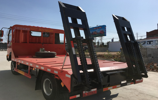 上裝配置:上裝橫梁采用100*100*5mmf方管,橫梁間距25公分,平板采用5mm或者8mm厚花紋板,爬梯采用雙簧加強設(shè)計,帶有簡易后支腿,可選擇液壓折疊爬梯,,平板長度4.1米 寬度,2.3米/2.4米兩種寬度可選, 平板離地高度90公分,是運輸8噸左右小型挖掘機、小型工程機械等最理想的拖車。